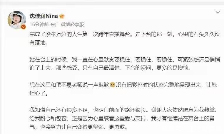 她那篇说念歉信里透着赤诚满满,她说这是她头一趟站上跨年直播的舞台,