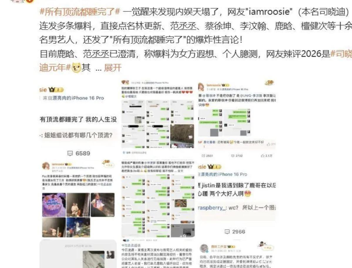26年才刚开场,文娱圈就掀翻一场“地面震”,连顶流鹿晗王人被拖下水了。1月3号凌晨,网红司晓迪就在酬酢平台上连着爆了好几个猛料。