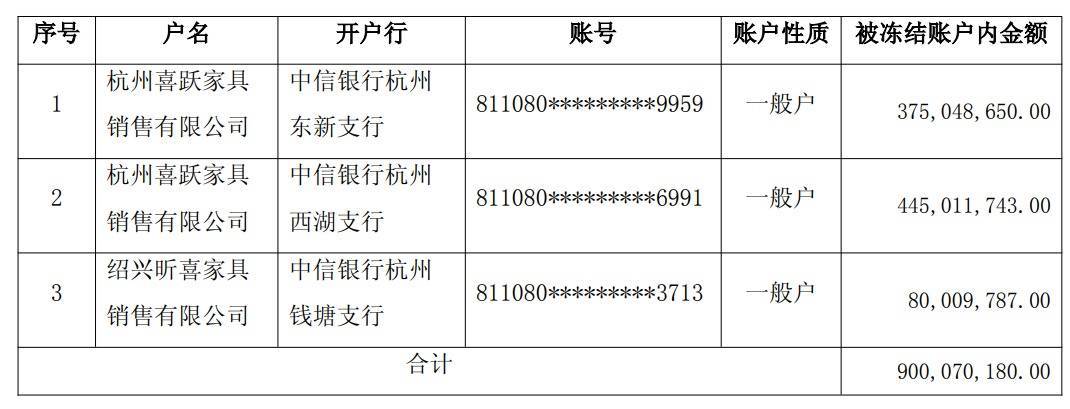 喜临门称,上述银行账户冻结是公司为保护资金安全而主动进行的保护性冻结,不存在被第三方冻结的情形。