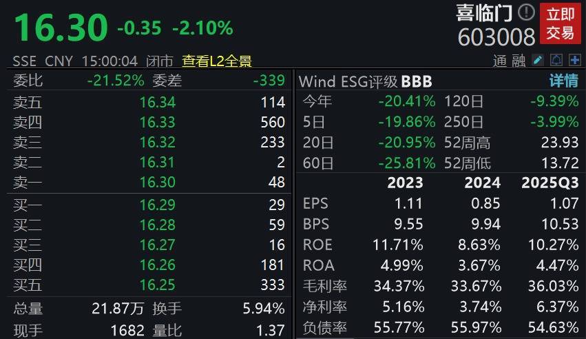 戒指3月27日收盘,喜临门报16.3元/股,跌幅为2.1%。